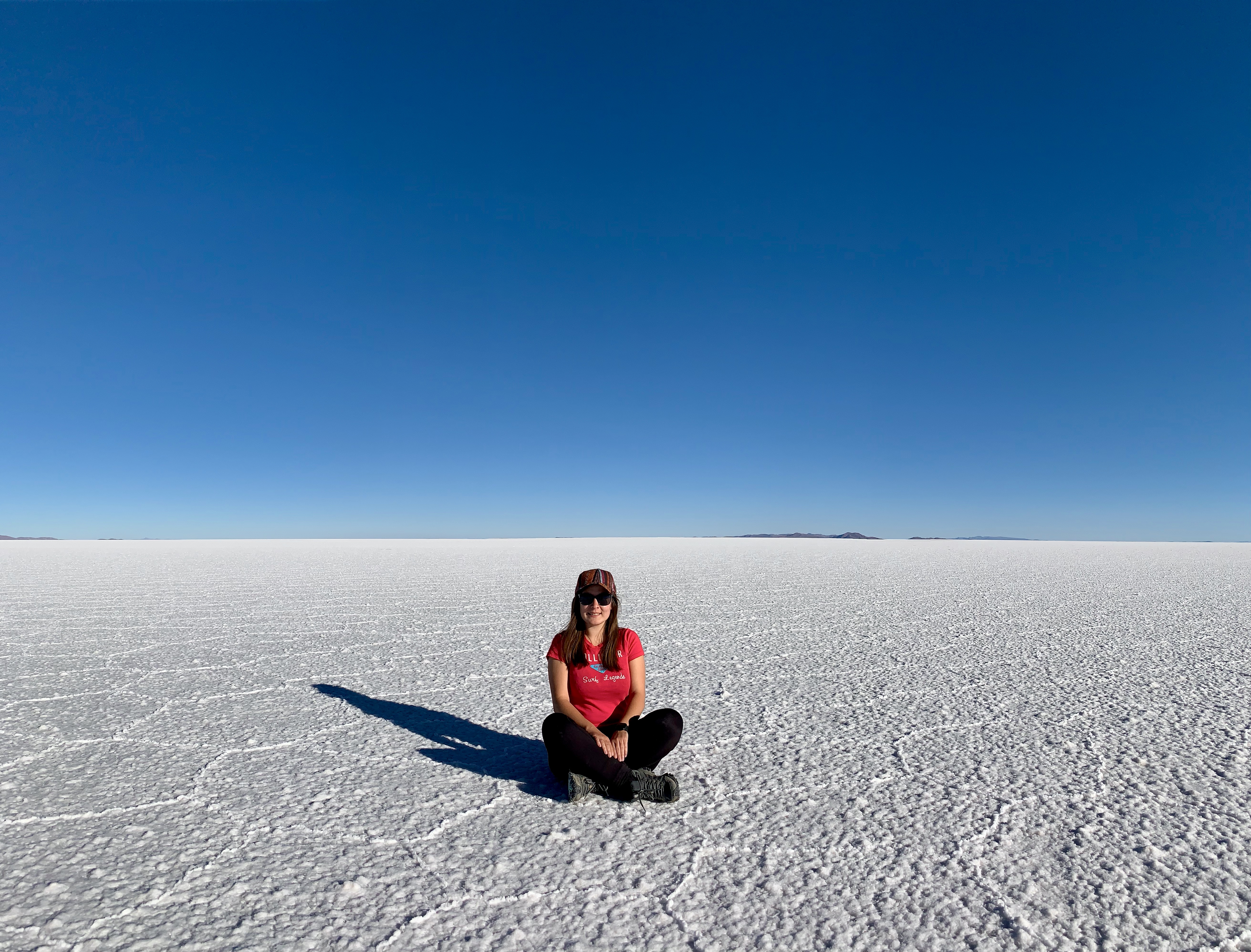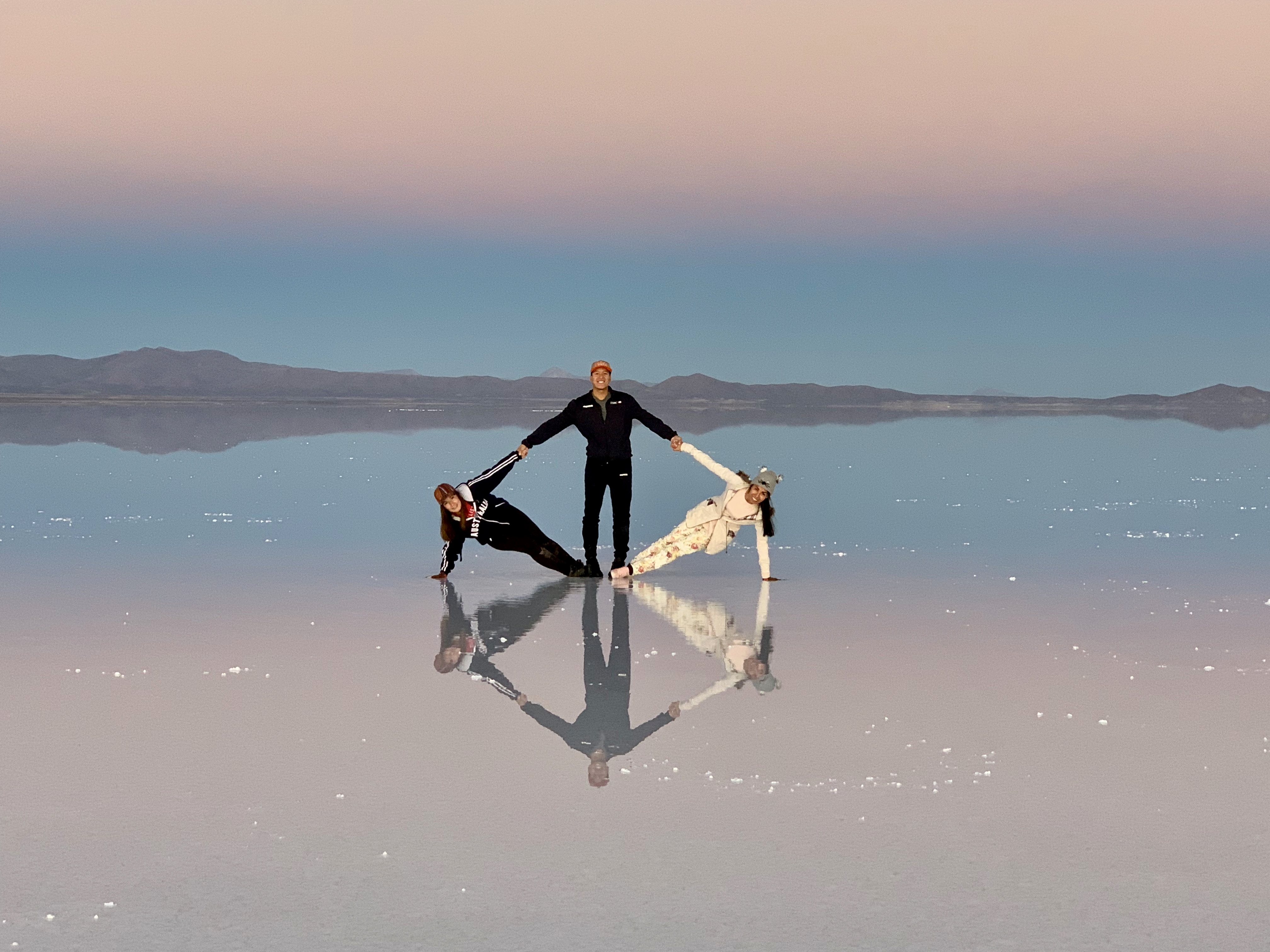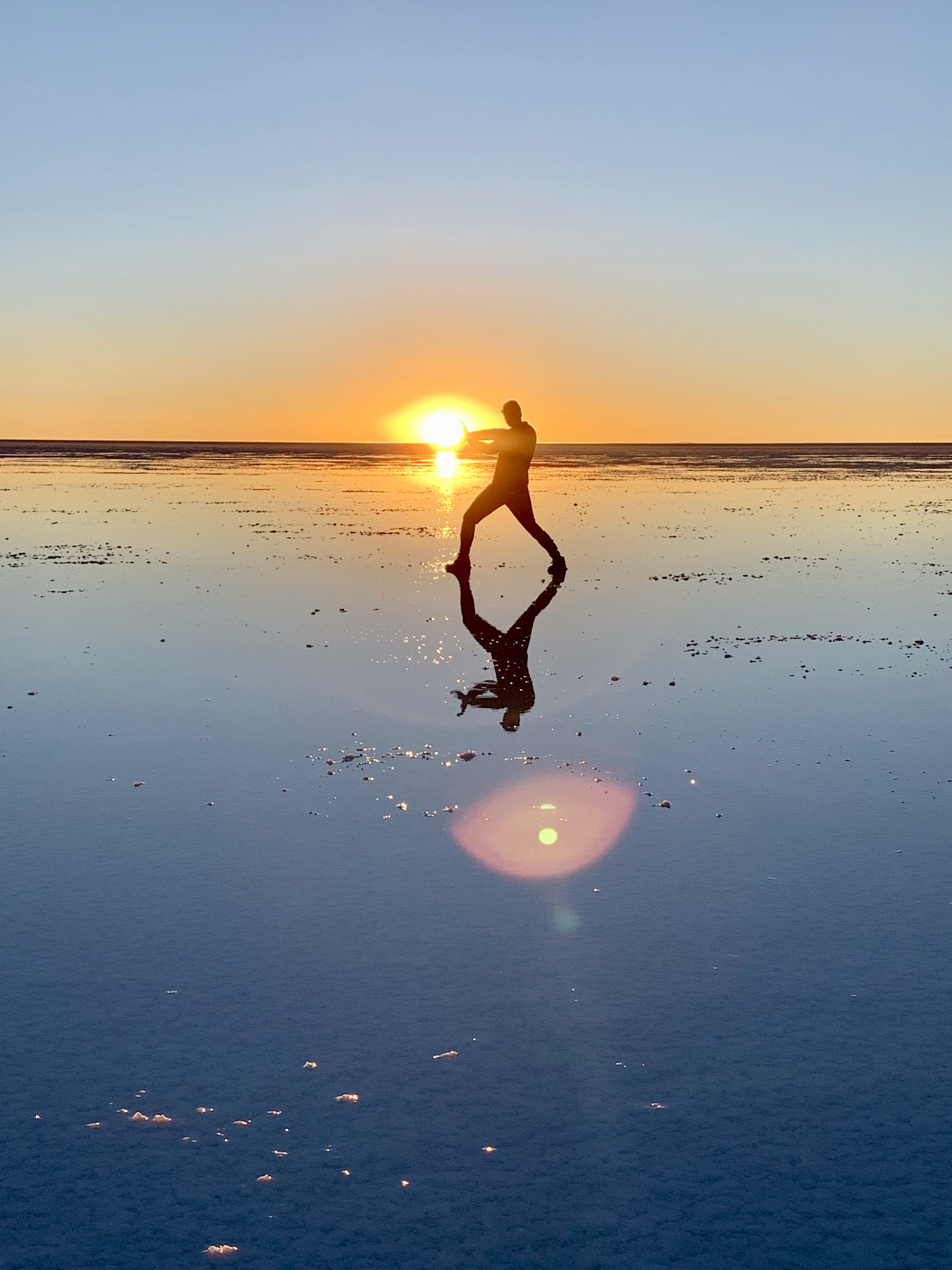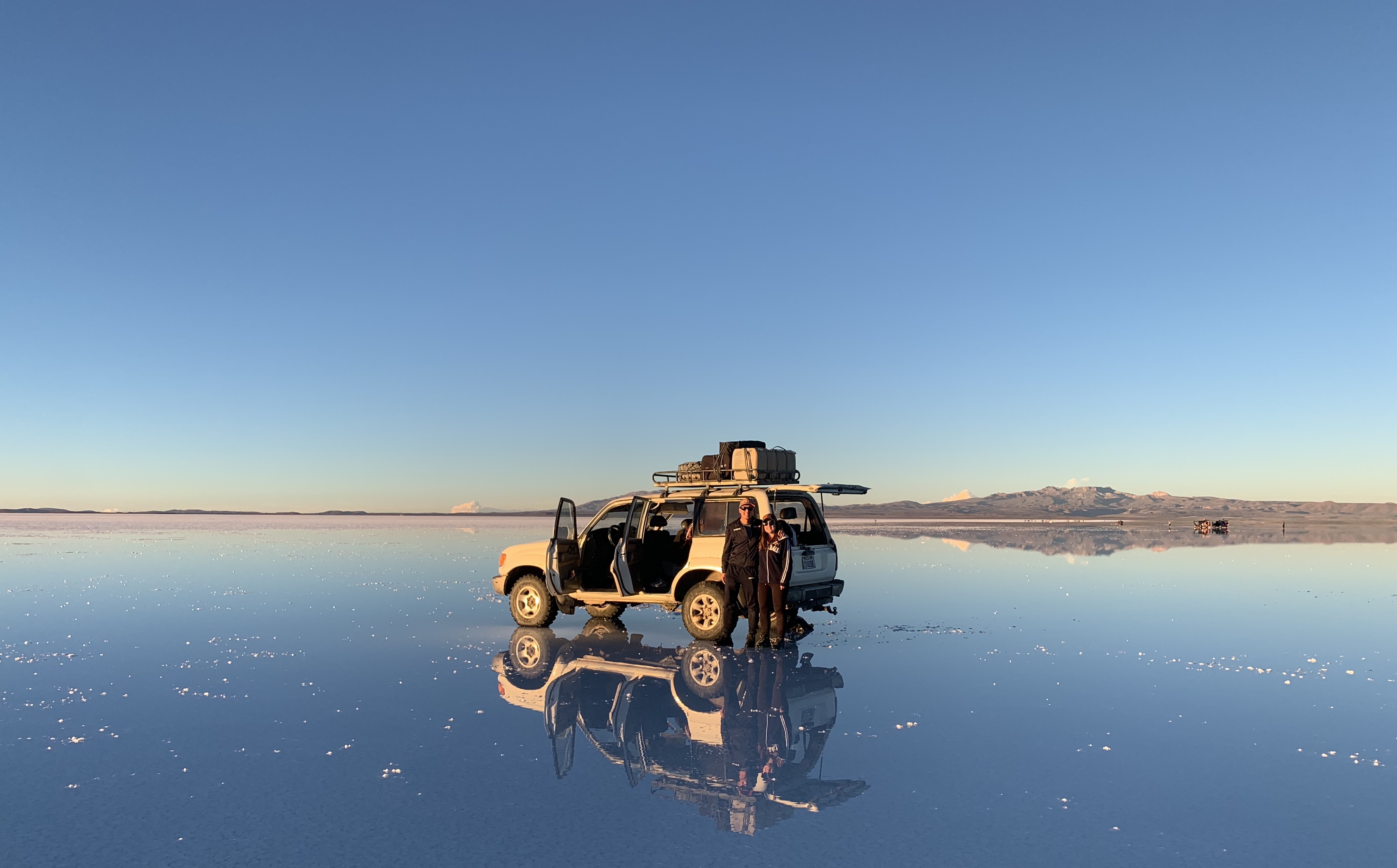 Après avoir laissé parler notre imagination pour les photos, nous sommes allés là où il y a un peu d’eau dans le désert de sel ce qui fait un effet miroir parfait ! C’était vraiment magique ! Je rappelle qu’aucune de nos photos n’ont été retouchées, ce sont les couleurs naturelles !