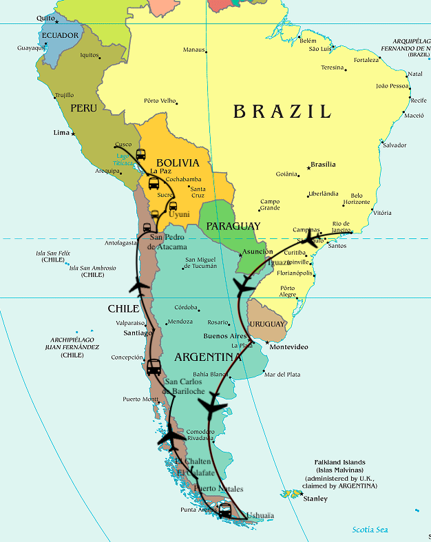 Carte récapitulative de notre voyage en Amérique du Sud.